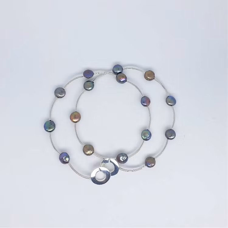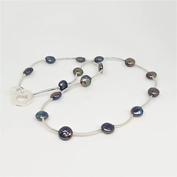 Halsband med vackra blå-violetta mynt-pärlor 8 mm, som är platta och ligger vackert runt halsen.