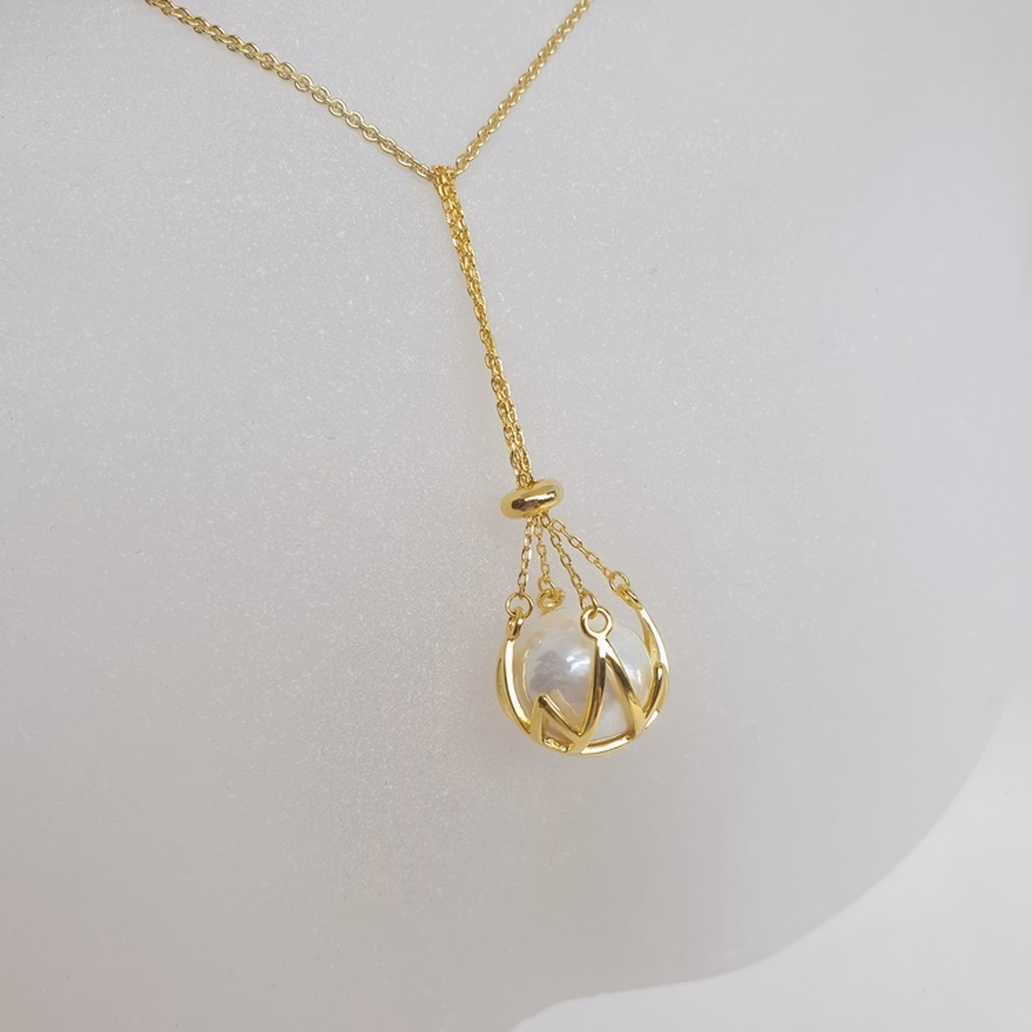 En stor vit pärla i en förgylld silverkorg med kedja