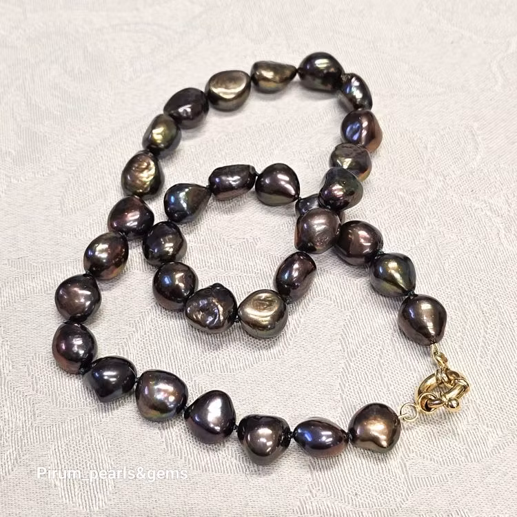 Halsband med vackra bruna och gröna sötvattenpärlor ca 10-12 mm.