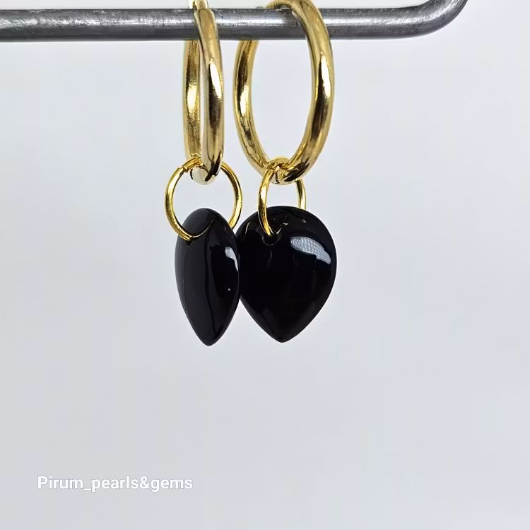 Onyx svart platt, droppe, på nickelfri silverögla med liten cubic zircon för att hänga på creolring eller öronkrok.