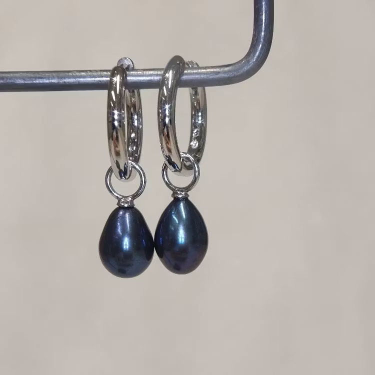 Stor blå vackert droppformad sötvattenpärla ca 8-8,5 mm på nickelfri silverögla för att hänga på creolring eller öronkrok.