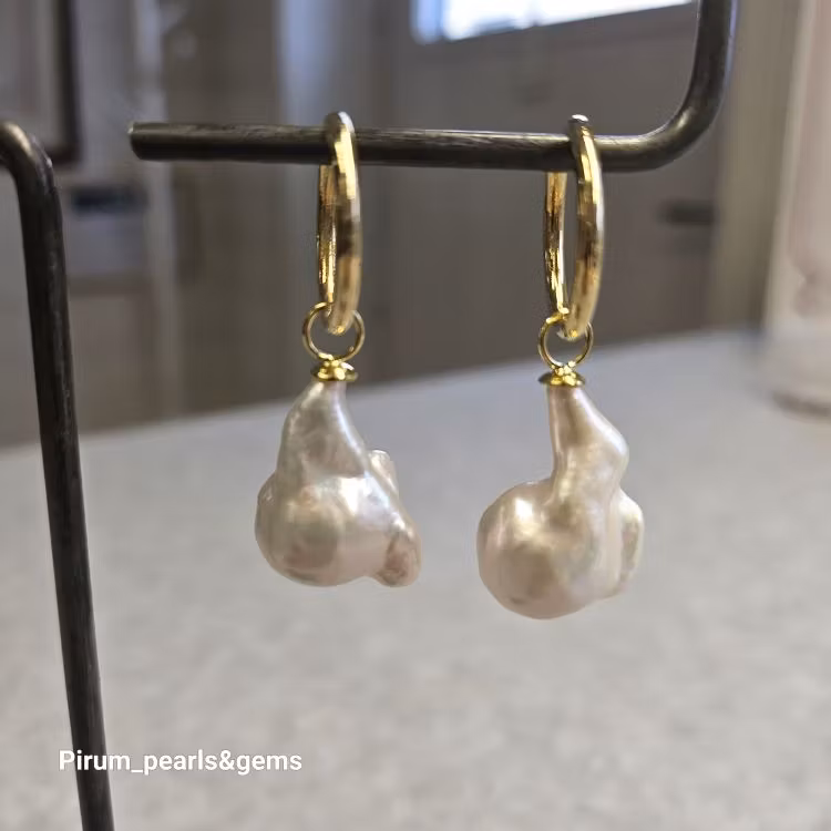 Material Vit sötvattenpärla 15x20 mm barock med vacker lyster, på nickelfri förgylld silverögla för att hänga på creolring eller öronkrok.