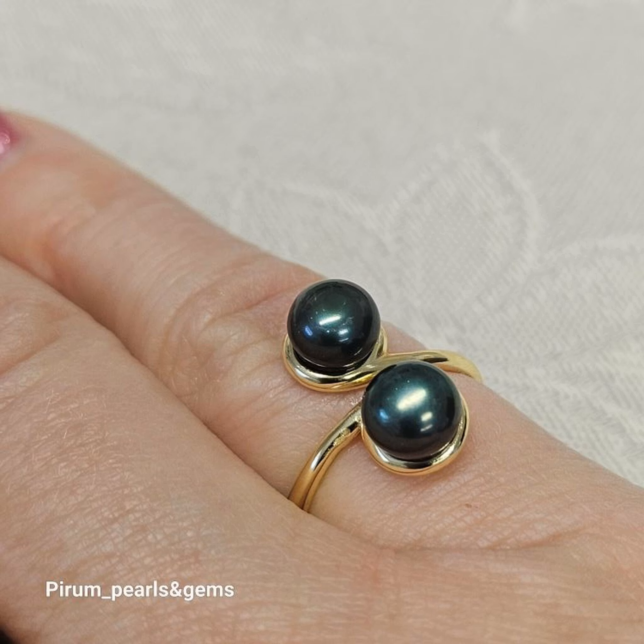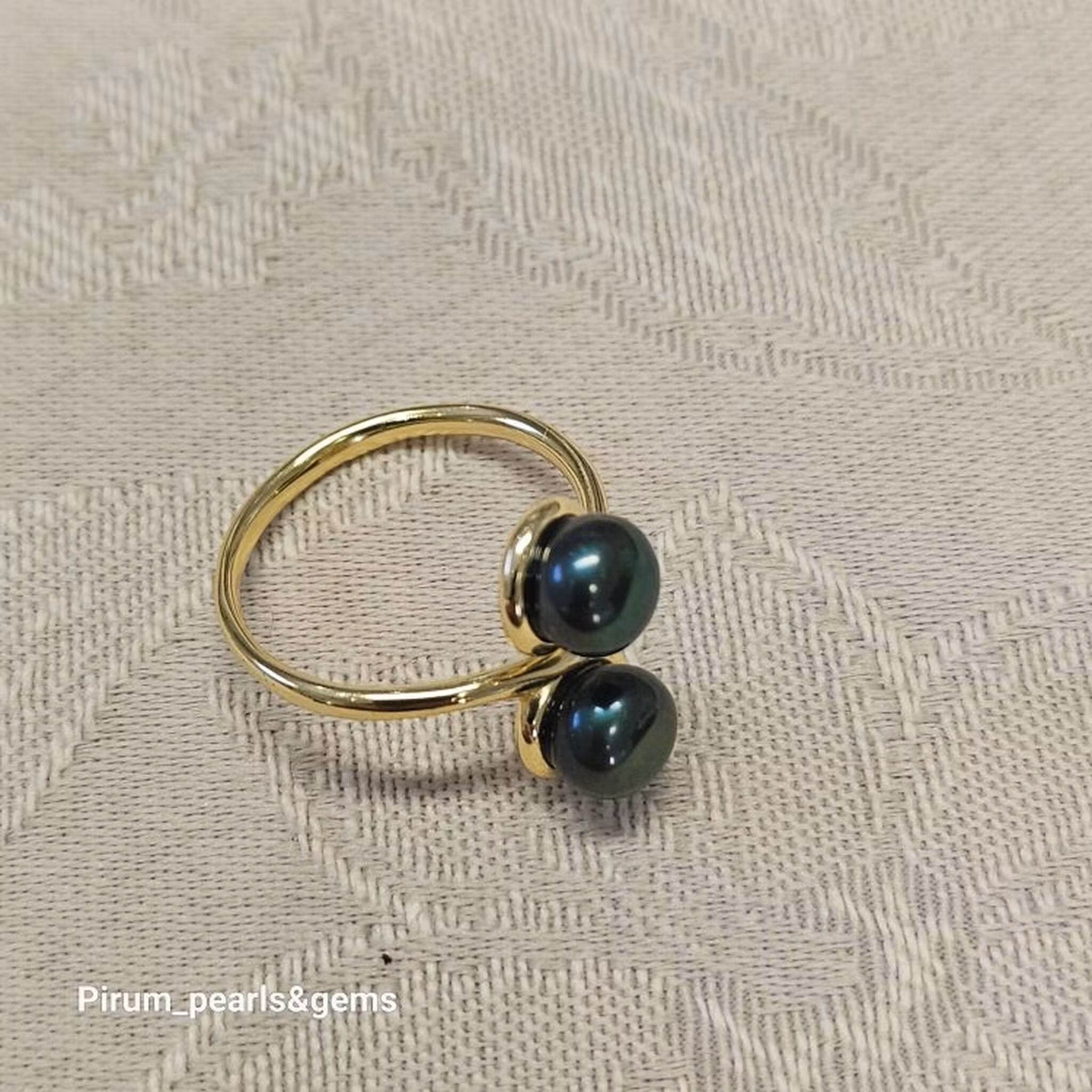 Förgylld silverring med design som går omlott vid pärlorna, två mörkgröna odlade sötvattenpärlor ca 6 mm. Silverringen är enkel att justera så den passar önskat finger.
