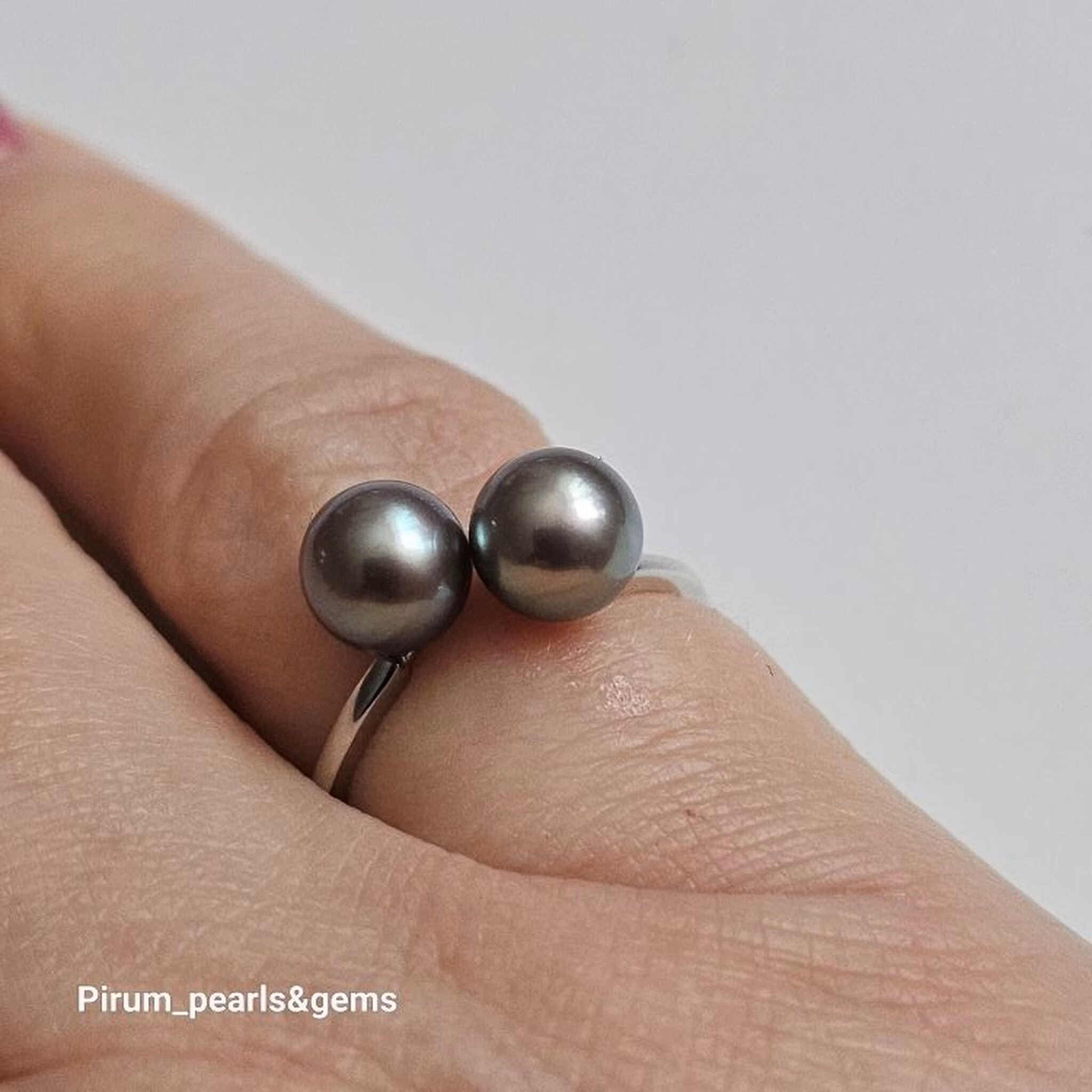 Silverring med design som går omlott vid pärlorna, två grå-gröna odlade sötvattenpärlor ca 5 mm. Silverringen är enkel att justera så den passar önskat finger.